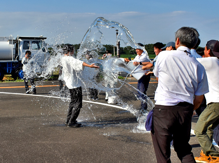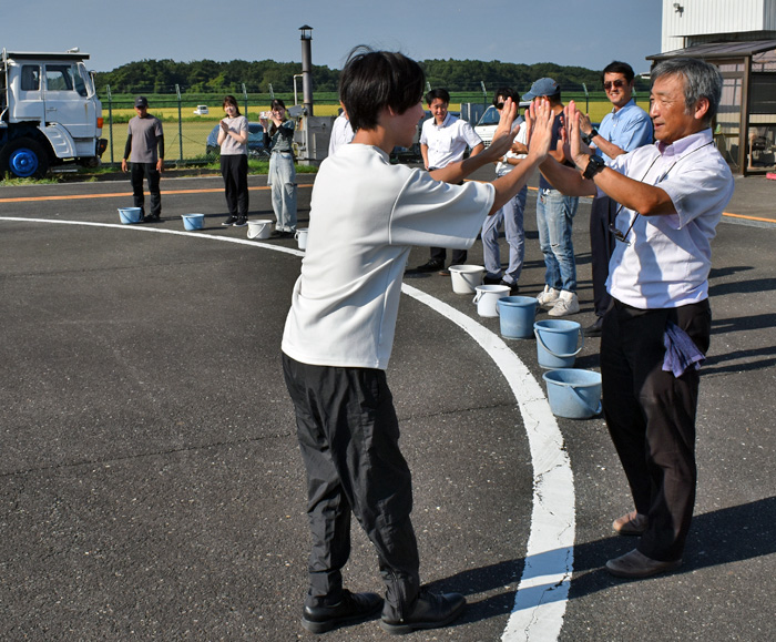 「単独飛行をできてとても嬉しかったです。飛んでいるうちに段々景色も見えてきました。今後も免許取得に向けて頑張ります。ありがとうございました。」 と、笑顔で挨拶のあと、本人の是非との希望もあり、航空界恒例の全員からのお祝いの水かけで祝福しました。