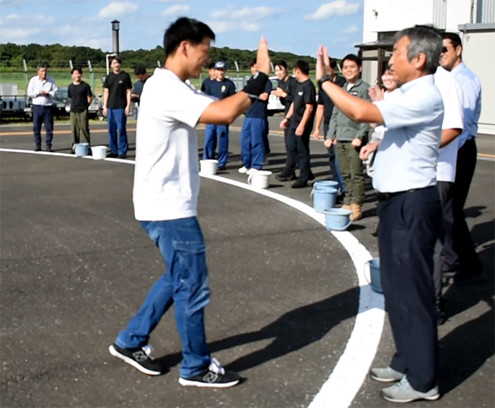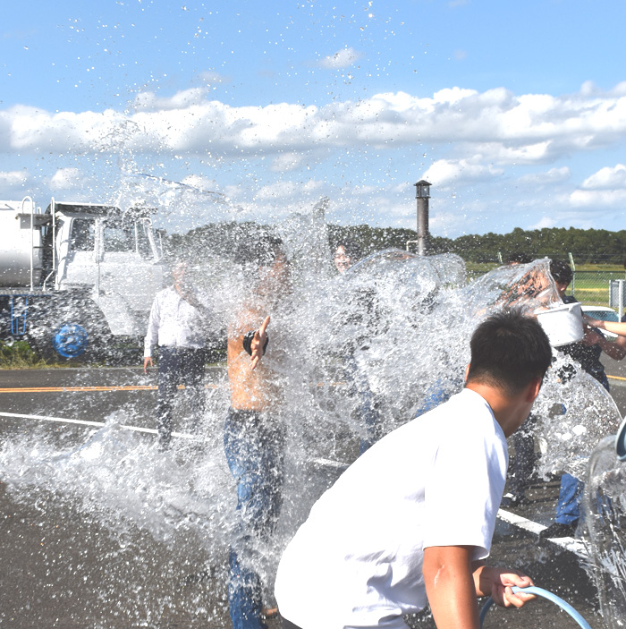 「本日の単独飛行を地上からもフォローしていただきありがとうございました。引き続き実地試験合格に向けて頑張ります。」 と、笑顔で挨拶のあと、本人の是非との希望もあり、航空界恒例の全員からのお祝いの水かけで祝福しました。