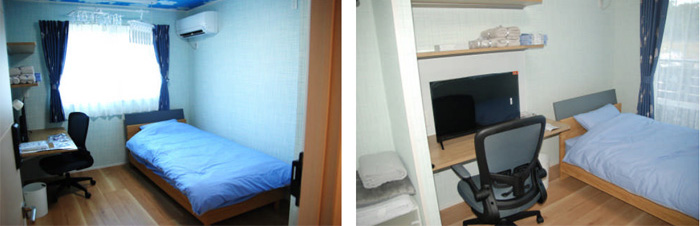 天井は快晴の空模様であり、寝ながら飛行をイメージできます。カーテンはふくろうの絵柄になっており、苦労知らずで訓練し、合格を祈願している私どもの願いが込められています。
