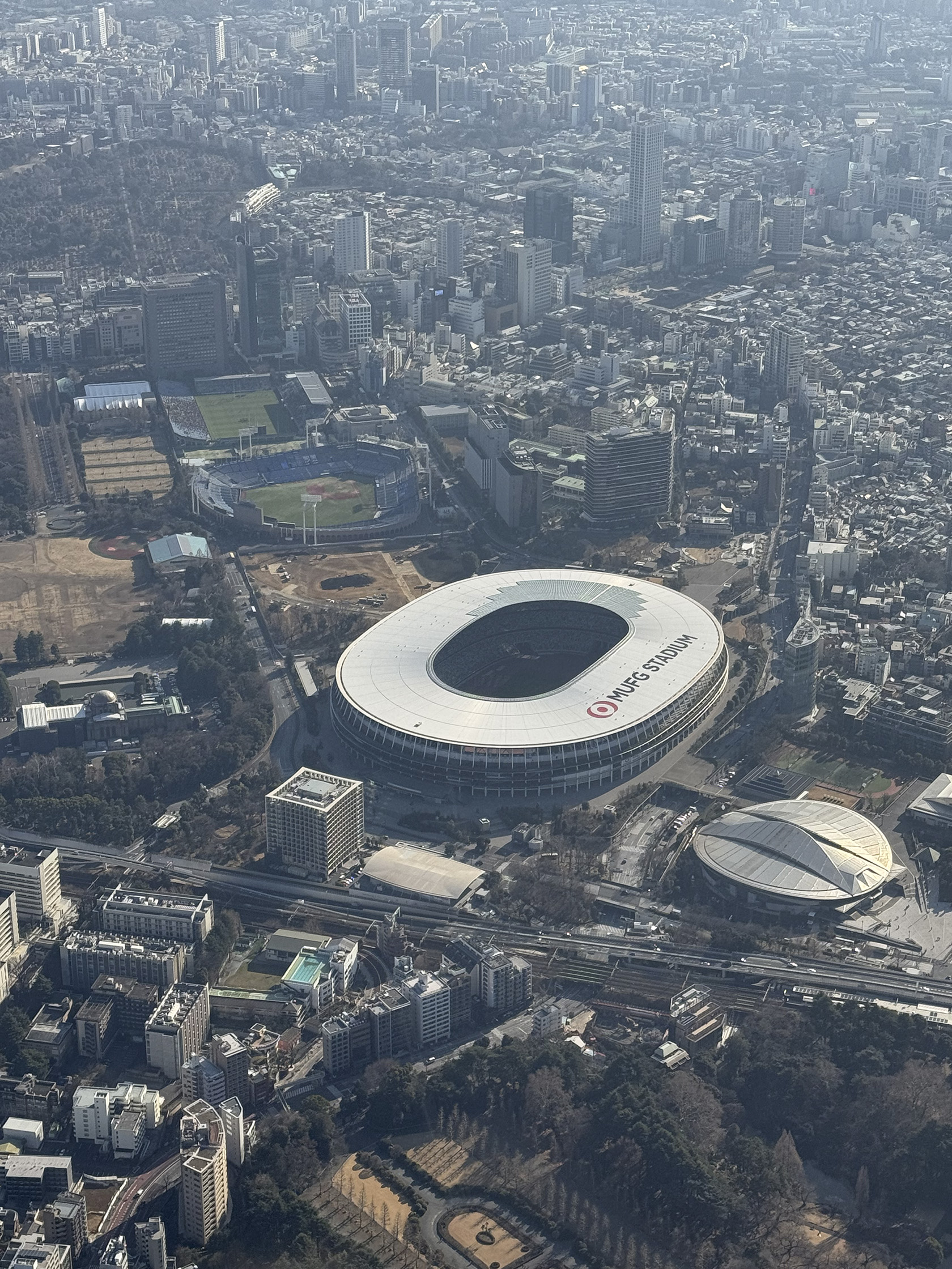 国立競技場の上空です。国立競技場命名権を三菱UFJフィナンシャルグループが取得したため、 2026年1月1日から「MUFGスタジアム」として呼称されるようになったそうです。