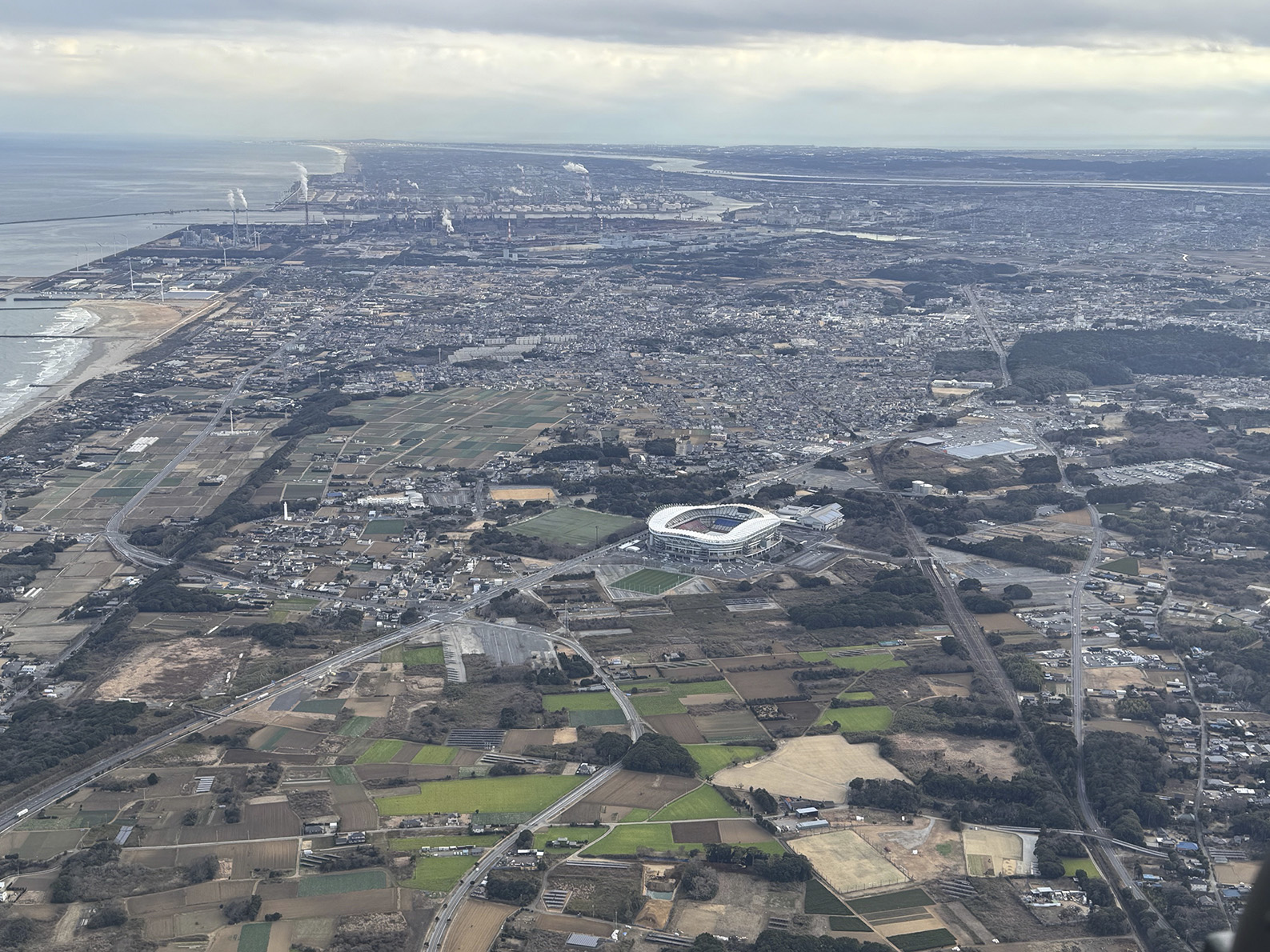 中央に白い屋根のスタジアムは鹿島アントラーズのホームスタジアムである茨城県立鹿島サッカースタジアムです。 愛称は2025年7月1日から「メルカリスタジアム」となったそうです。