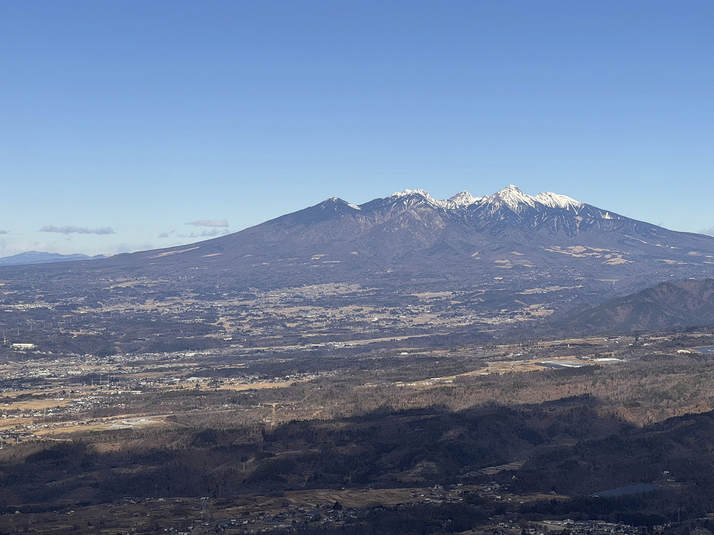 甲斐市付近から見た八ヶ岳の様子です。山頂付近には雪が見えます。