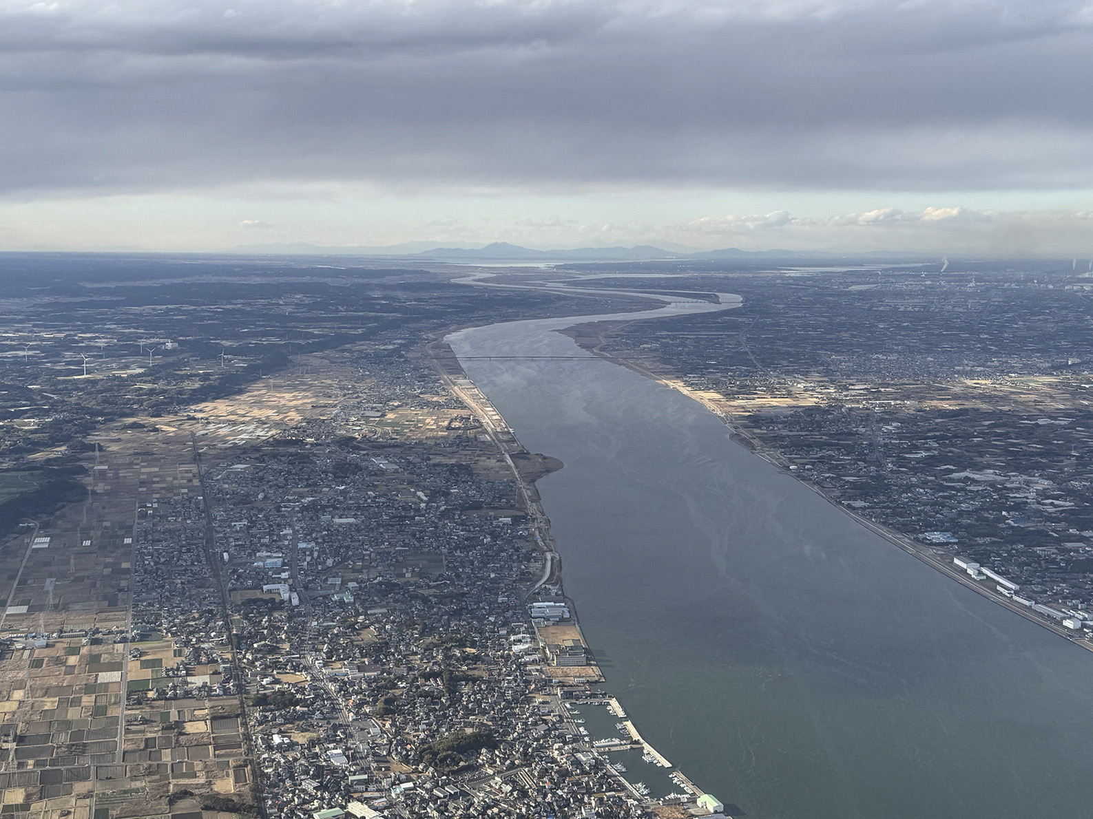 銚子付近から雄大な利根川の遠く奥には筑波山を確認できます。