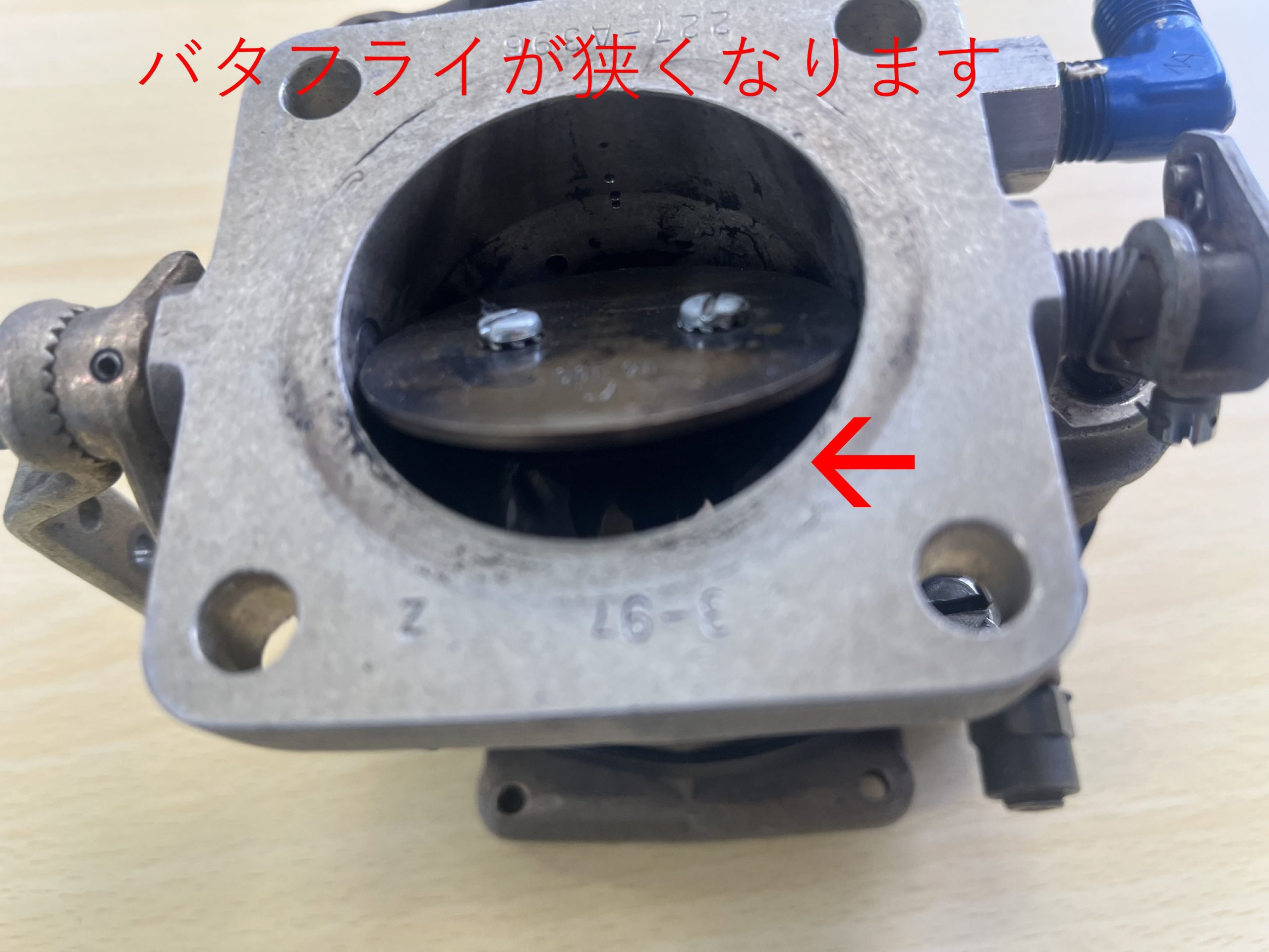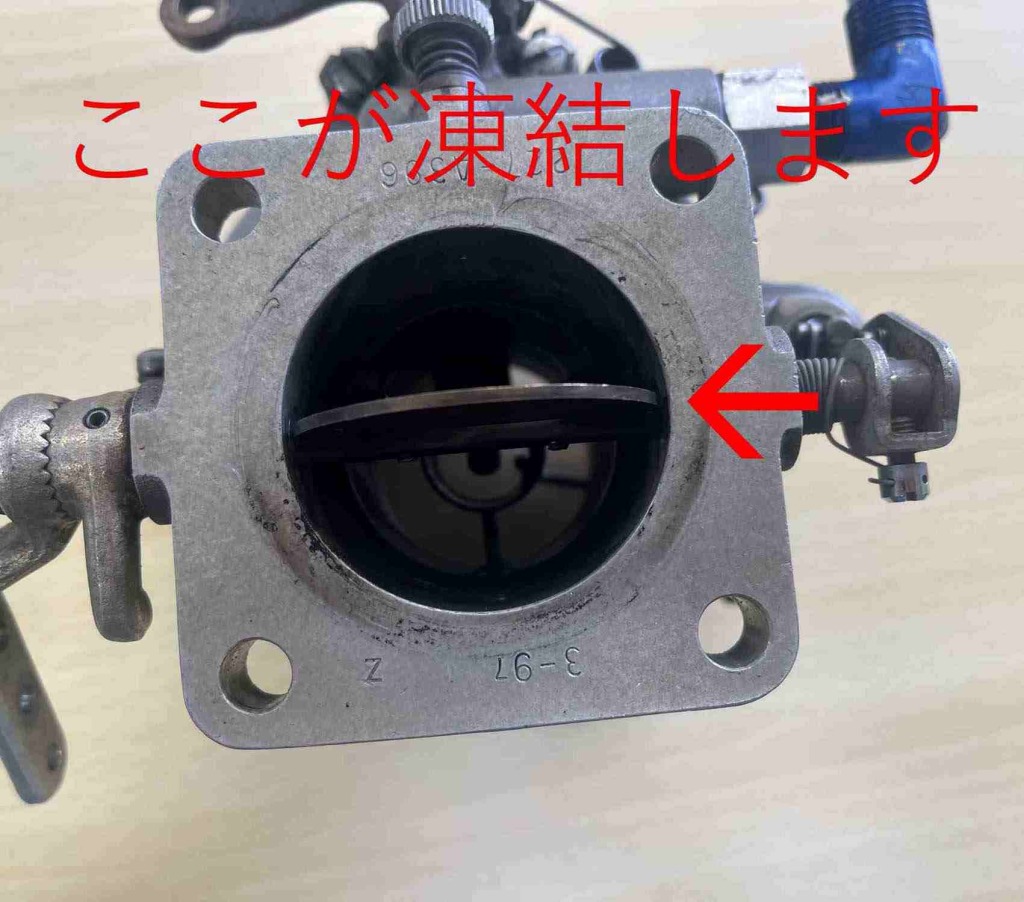 キャブレター内でスロットルの開きが小さくなると、混合器の流速は速くなりますがその分圧力が低下します。圧力が低下したことにより温度が下がり、氷が発生します。